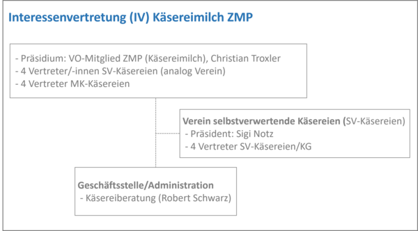 Die administrativen Aufgaben der "Interessenvertretung Käsereimilch" übernimmt die Käsereiberatung ZMP. Diese macht bereits schon die Administration des Vereins selbstverwertende Käsereien.